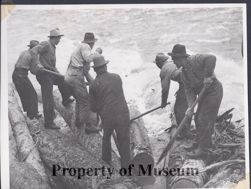 Diamond Match log drive in 1942 which was featured in The Timberman, July 1943. Six men try to free a log with peavey poles.